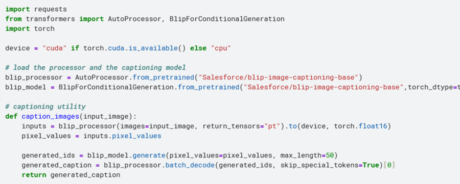 Далее код загружает модель BLIP и создаёт функцию caption_images, которая автоматически генерирует подпись (caption) к изображению.