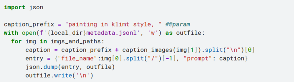 Далее необходимо было проверить, что все верно, и вывести содержимое файла metadata.jsonl, в котором каждая строка — отдельная подпись (caption) к изображению в формате JSON.