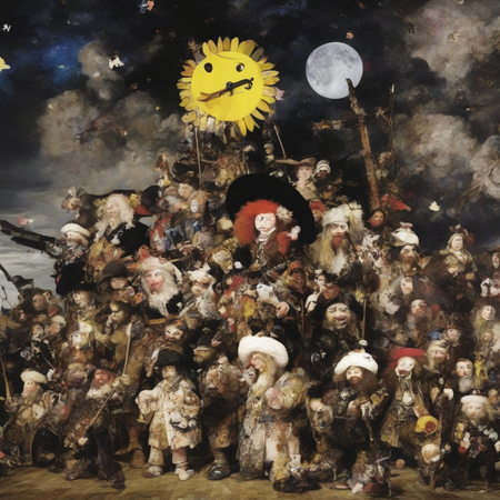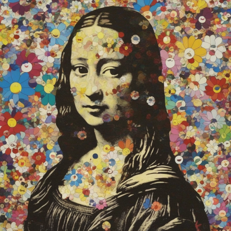 photo collage in TAKASHI MURAKAMI style, Mona Lisa, (Djokonda) // photo collage in TAKASHI MURAKAMI style, The Night Watch (Rembrandt van Rijn)