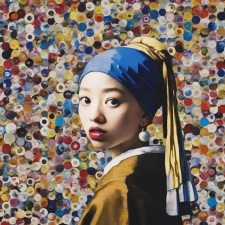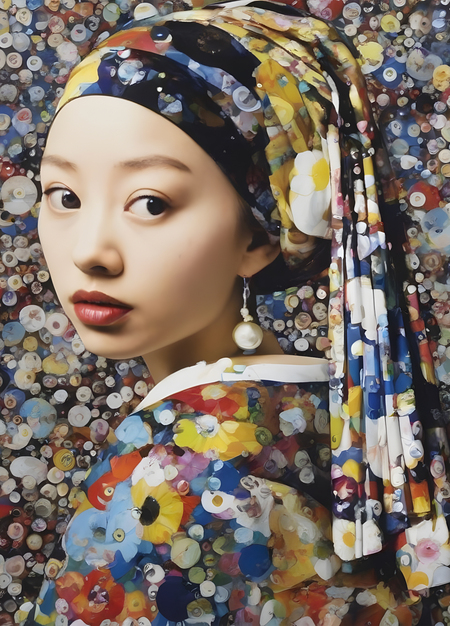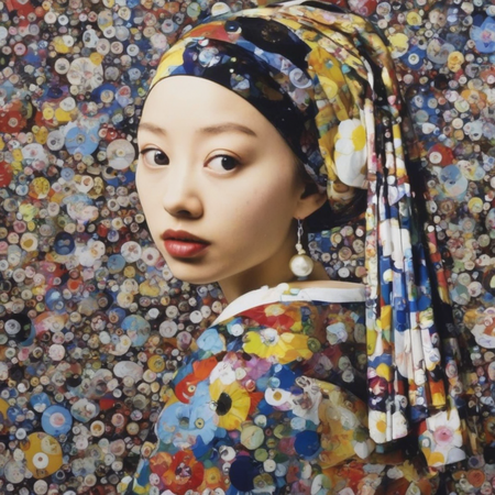 photo collage in TAKASHI MURAKAMI style, Girl with a Pearl Earring (Johannes Vermeer)