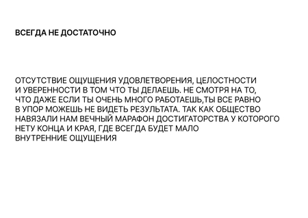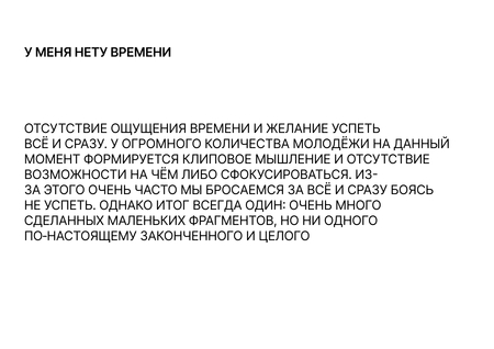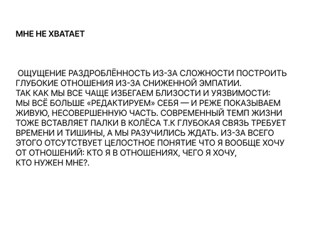 «Я начинаю — и бросаю. Я хватаюсь за всё — но ничего не довожу. Моя жизнь состоит из фрагментов: заметок, задач, мыслей. Но не из завершённых дел, прожитых моментов или настоящего присутствия»