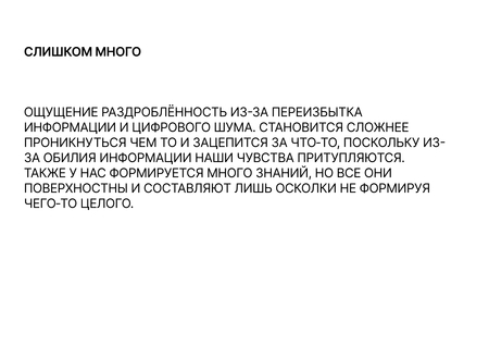 «Слишком много всего. Даже хорошие идеи, книги, люди становятся как шум. Кажется, я всё знаю и ничего не понимаю. Я слышу сто голосов, но ни один не говорит по‑настоящему со мной. Я пытаюсь схватить хоть что‑то важное, но пальцы проходят сквозь поток. Вечером я не чувствую, что прожил день — я просто прокрутил его»