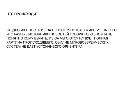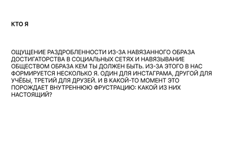 Мой проект посвящён моим ровесникам выросшим в эпоху интернета и социальных сетей. Для нашего поколения проблема раздроблённости и отсуствия целостного восприятия стоит особо остро. Мы перегружены информацией, навязанными нам эмоциями и идеальными образами. Всё это мешает нам воспринимать себя целостно