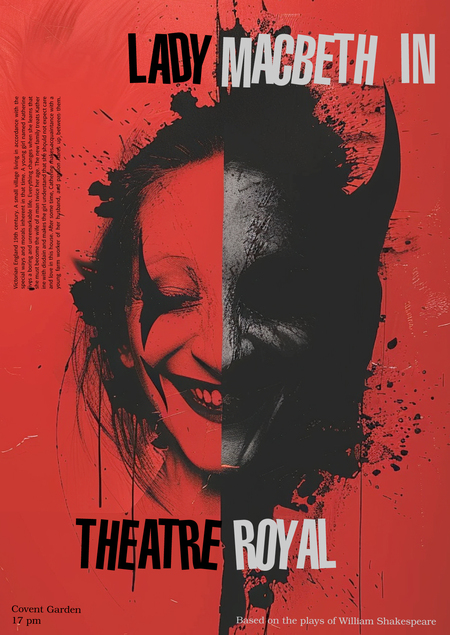 Метафорой первого плаката стало переходное состояние главной героини: от Леди Макбет к бесчувственному, демоническому образу, которым движет желание власти и богатства. Человеческие черты размываются — остаётся лишь силуэт, отдалённо напоминающий человеческое начало. Двойственность подчёркивается и цветом в типографике, а фоном становится красный цвет, символ пролитой крови и убийств, совершённых в пьесе.