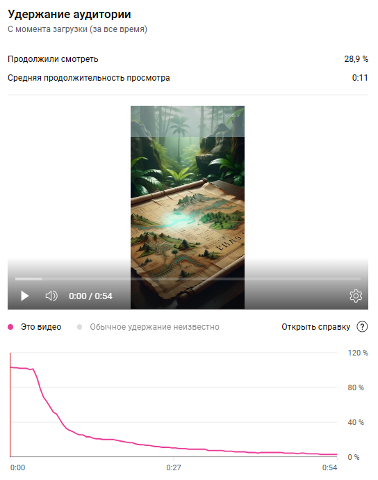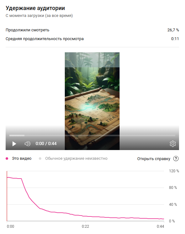 Вовлеченность аудитории: Средняя продолжительность просмотра: 11 секунд. Удержание аудитории: 26,7% зрителей продолжили смотреть видео. Реакция зрителей: 73,3% не досмотрели ролик до конца.