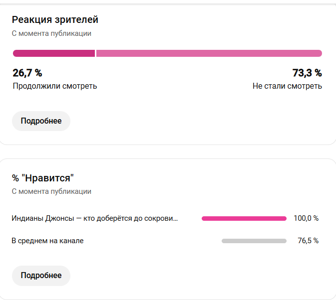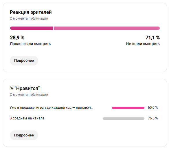 Вовлеченность аудитории: Средняя продолжительность просмотра: 11 секунд (как и в предыдущем видео). Удержание аудитории: 28,9% зрителей продолжили смотреть — незначительный рост (+2,2%) по сравнению с прошлым роликом. Реакция зрителей: 71,1% не досмотрели видео до конца.