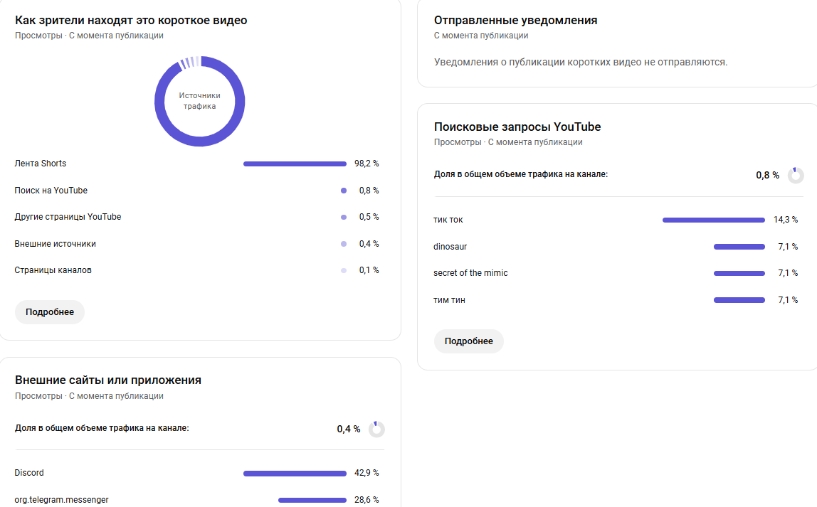 Источники трафика: Основной источник просмотров — лента Shorts (98,2%). Остальные каналы (поиск, внешние источники, страницы каналов) составляют менее 2%.