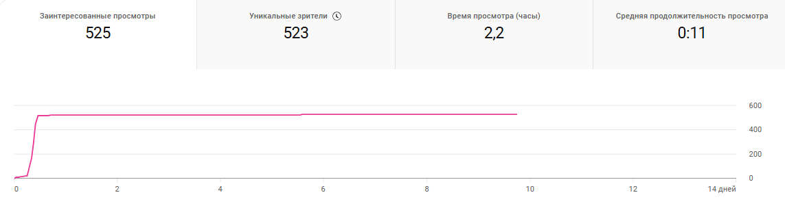 Просмотры: 1,6 тыс. (+1 594 с момента публикации). Прирост подписчиков: +1. Уникальные зрители: 523 из 525 заинтересованных просмотров.