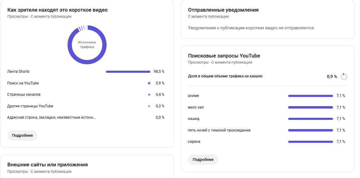 Источники трафика: Подавляющее большинство просмотров (95,5%) пришло из ленты Shorts. Остальные источники (поиск, страницы каналов и др.) суммарно дали менее 5% трафика.