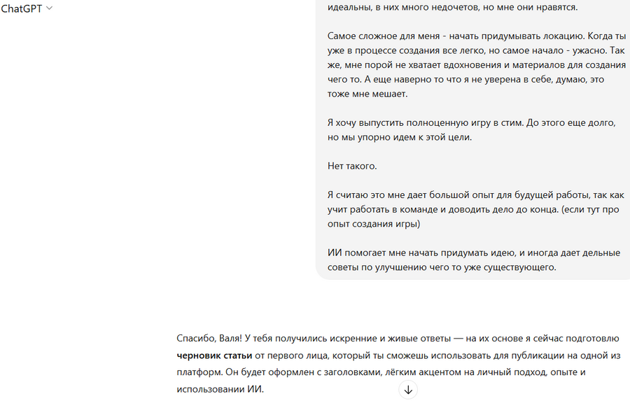 Тем не менее, материал позволил структурировать и зафиксировать собственный подход к геймдизайну и работе с ИИ. Он также стал частью общего цифрового следа проекта и может использоваться как дополнительная точка для самоидентификации в профессии.