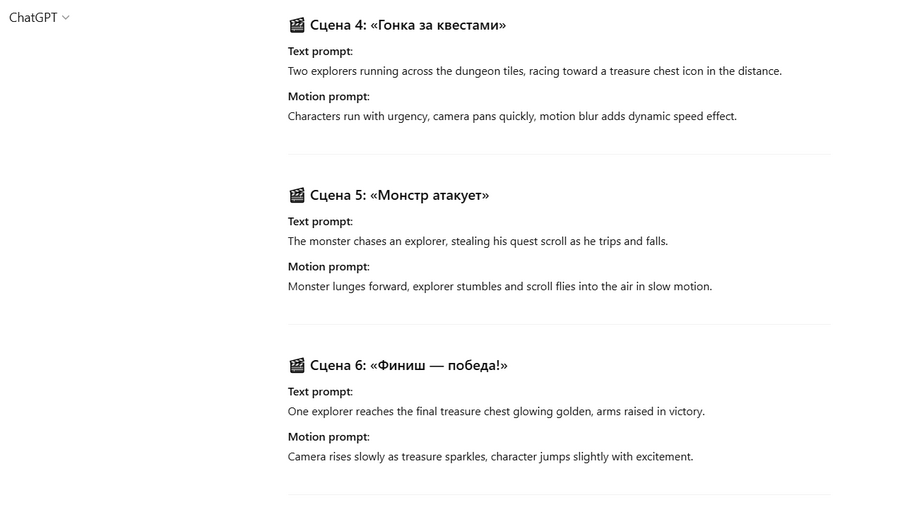 ChatGPT использовался для генерации идей, помощи в написании статьи, разработки сценариев и текстов озвучки. Leonardo.Ai применялся для визуализации игровых сцен, локаций и персонажей, которые затем использовались как в тексте, так и в видеороликах. Polo AI стал инструментом для генерации видеодвижения на основе статичных изображений, что позволило оживить сцены и создать короткие динамичные ролики. ElevenLabs использовался для синтеза озвучки на русском языке, что сделало видео более естественным и убедительным для зрителя.