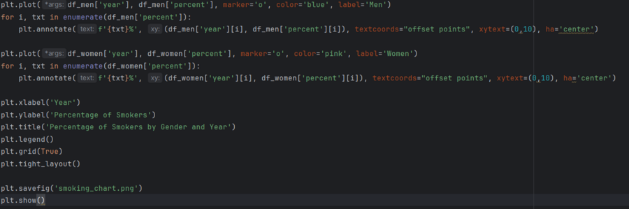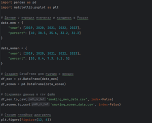 Код для линейной диаграммы, визуализирующий процент курящих мужчин и женщин, а также тенденцию снижения этого показателя за 5 лет.