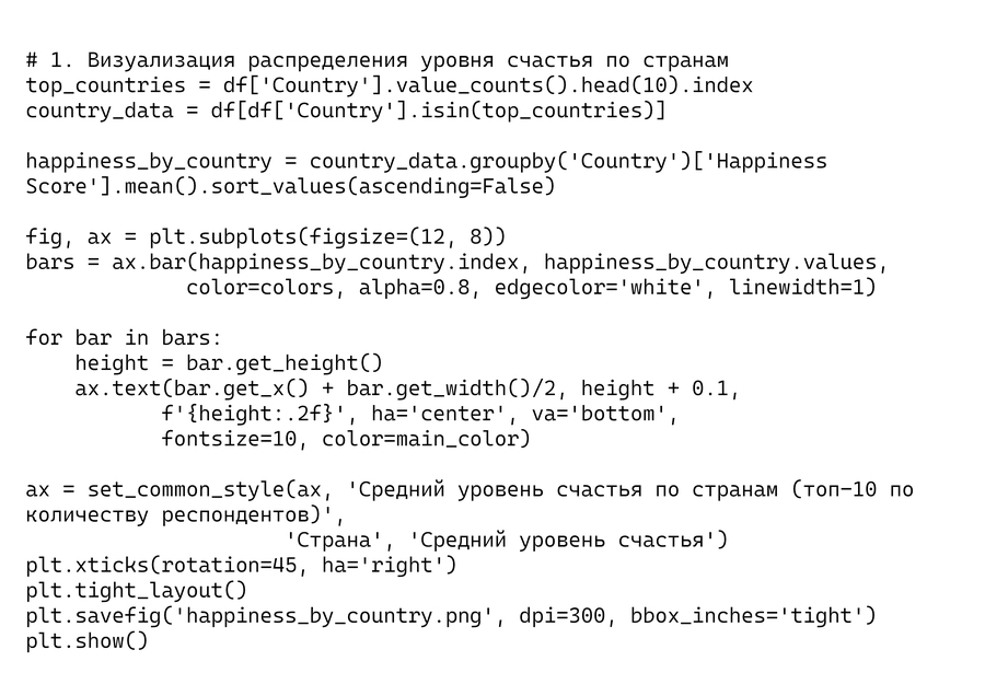 На этом графике представлены средние уровни счастья по странам с наибольшим количеством респондентов в выборке. Интересно заметить значительные различия между странами, которые могут быть связаны с культурными, экономическими и социальными факторами. Страны Скандинавии и Западной Европы показывают более высокие значения, что соответствует международным исследованиям счастья.