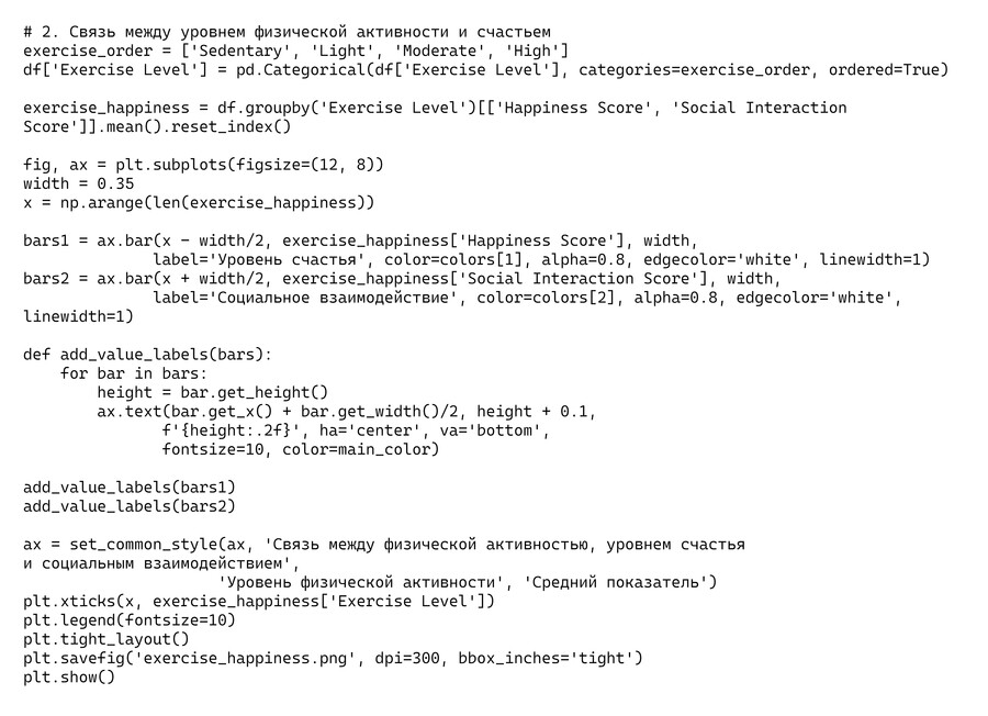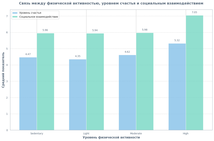 Данная визуализация ясно демонстрирует позитивную связь между уровнем физической активности и показателями психологического благополучия. Люди с высоким уровнем физической активности отмечают более высокие уровни счастья и социального взаимодействия. Это подтверждает существующие научные данные о благотворном влиянии физических упражнений на психическое здоровье.