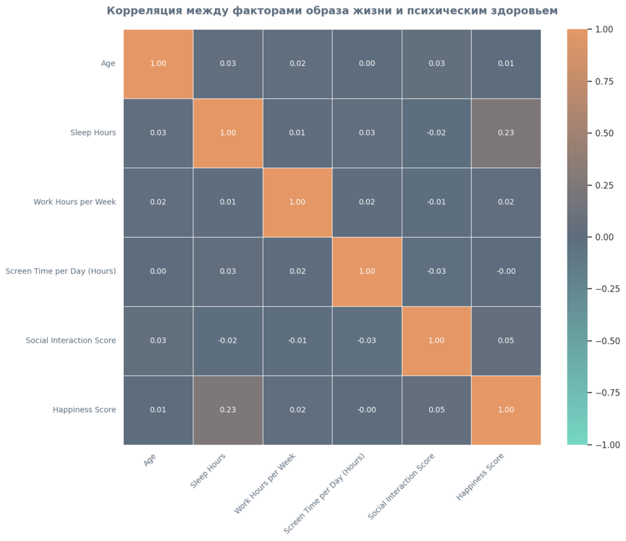 Тепловая карта корреляций наглядно показывает взаимосвязи между различными аспектами образа жизни и показателями психического здоровья. Особенно сильные положительные корреляции наблюдаются между социальным взаимодействием и счастьем, а также между сном и психологическим благополучием. Отрицательные корреляции видны между рабочими часами, экранным временем и уровнем счастья.