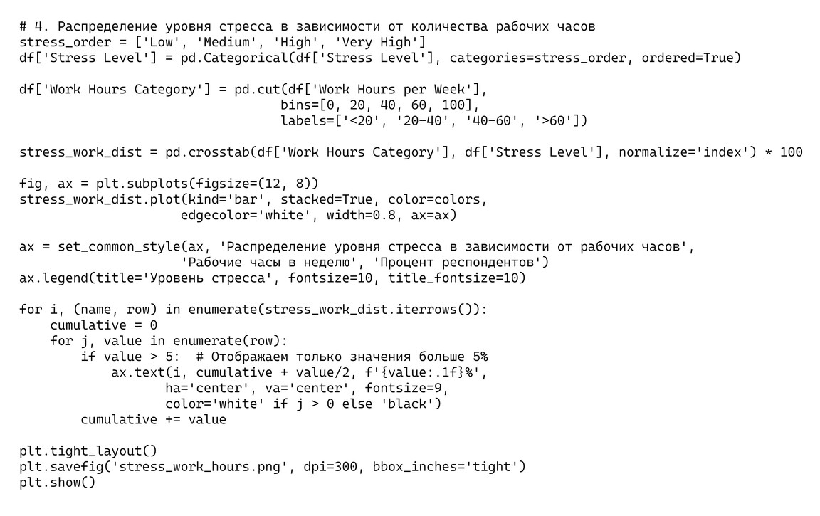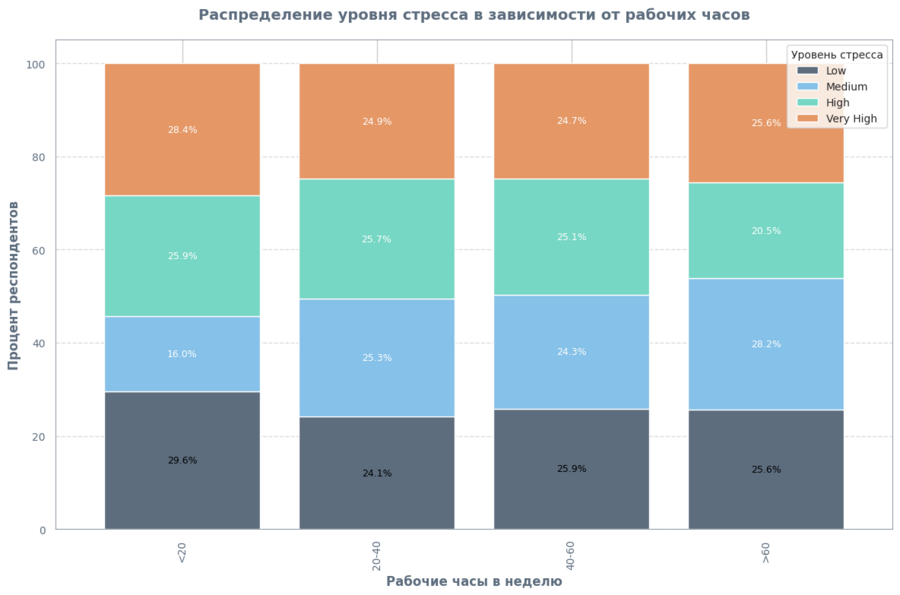 Стековая диаграмма наглядно демонстрирует, как увеличение рабочих часов связано с повышением уровня стресса. Среди респондентов, работающих более 60 часов в неделю, значительно выше процент людей с высоким и очень высоким уровнем стресса. Это указывает на важность баланса работы и личной жизни для психологического благополучия.