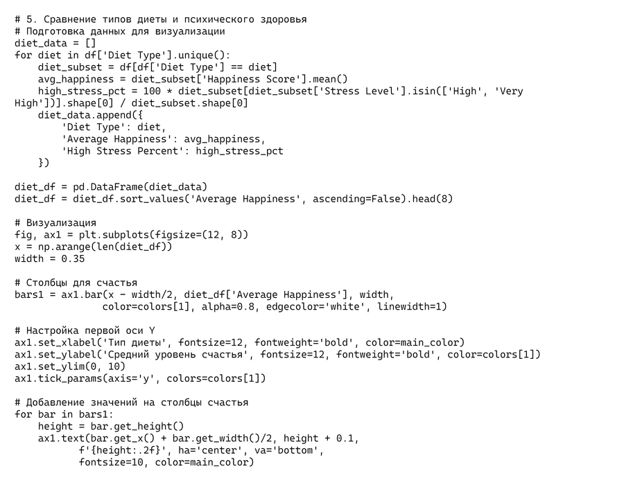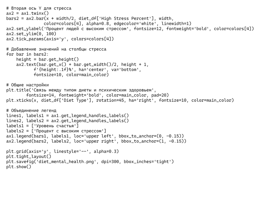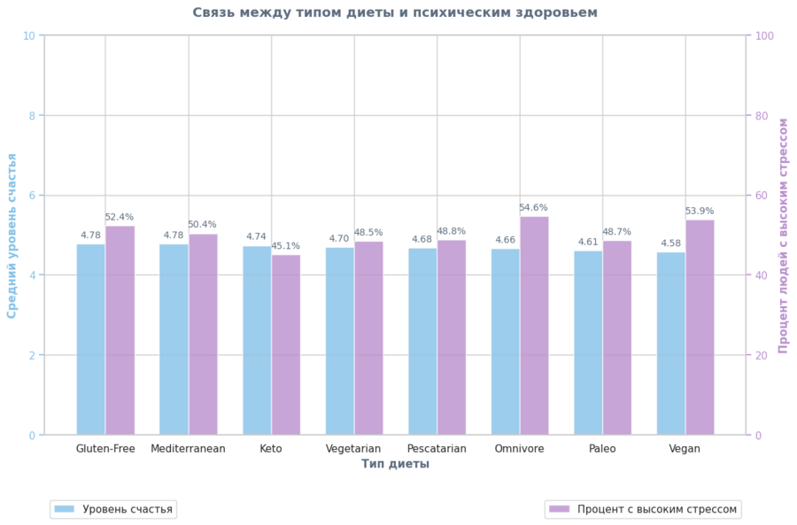 Этот график с двойной осью Y позволяет одновременно сравнить влияние разных типов диеты на уровень счастья и процент людей с высоким стрессом. Интересно заметить, что средиземноморская и вегетарианская диеты связаны с более высокими показателями счастья и меньшим уровнем стресса, в то время как диеты с высоким содержанием обработанных продуктов коррелируют с худшими показателями психического здоровья.