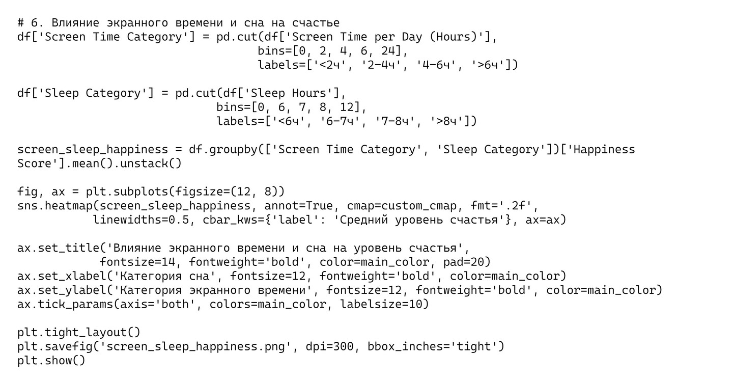 После загрузки датасета я выполнила первичный анализ, чтобы понять структуру данных и выявить возможные проблемы. Набор данных оказался достаточно чистым и не требовал серьезной предобработки. Однако для некоторых визуализаций потребовалось создать категориальные переменные на основе числовых данных. Например, для анализа влияния экранного времени и сна на уровень счастья я разделила непрерывные переменные на интервалы:
