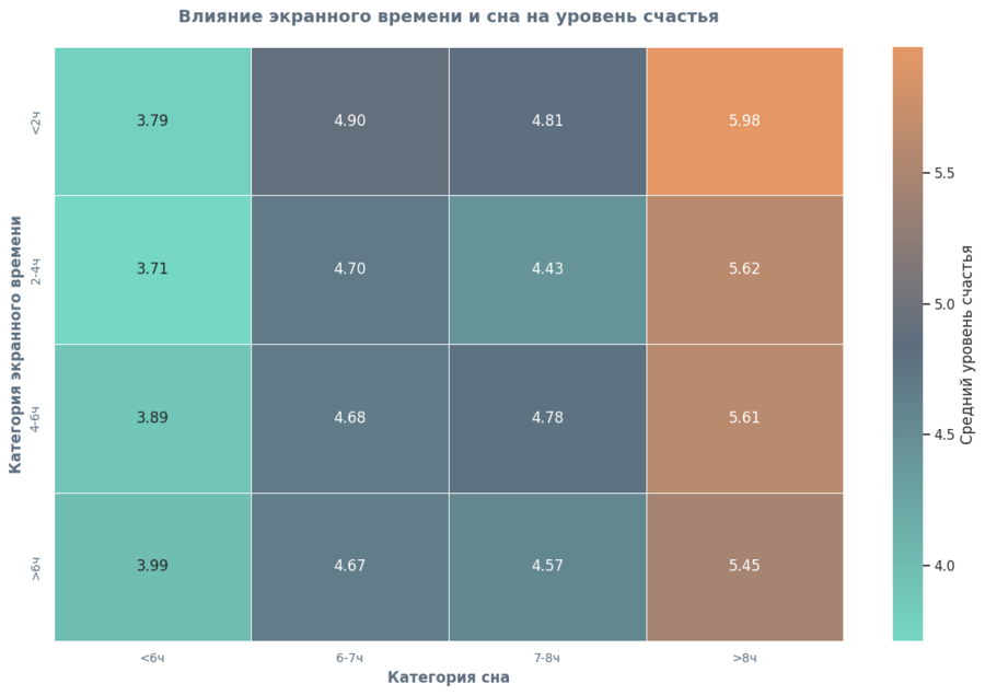 Тепловая карта наглядно показывает комбинированное влияние длительности сна и экранного времени на уровень счастья. Наиболее высокие показатели счастья наблюдаются у людей, которые спят 7-8 часов и проводят менее 2 часов перед экранами. С увеличением экранного времени и уменьшением продолжительности сна уровень счастья заметно снижается, что подтверждает важность здоровых привычек использования цифровых устройств и качественного сна.