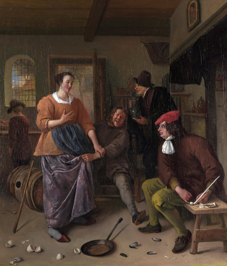 В своих работах он отражает сцены не только с азартной игрой, пьянством и танцами, но и пошлостью, вульгарностью и бордельной эстетикой. Можно увидеть настойчивость гостей таверн по отношению к хозяйке или приглашенным женщинам. На похоть указывают и лежащие на полу раскрытые мидии — в голландском искусстве морепродукты несут характер афродизиака, а сами устрицы отождествляются с женским лоном. В то время как разбитые яйца как частый символ в работах означает недостойное общество.
