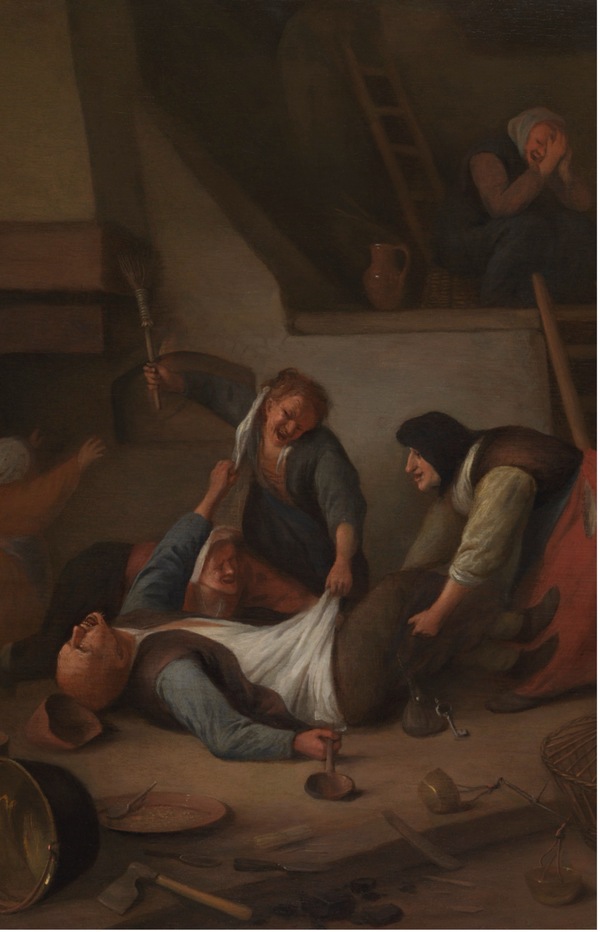 Произведения фламандского художника Питера Брейгель Младшего полны гротескных изображений голландского общества. Он карикатурно портретирует отдельных горожан, в дальнейшем погружая их в многофигурные композиции. Среди работ бытового жанра Брейгеля пространства таверн совсем не встречаются, в своем творчестве он акцентирует внимание на городских сценах праздников, свадеб и танцев. Его крестьянские мотивы совсем не правдивы, а весьма условны и иллюстративны. Они транслируют помешательство нидерландской деревни на быстрых радостях, глупости и танцах.