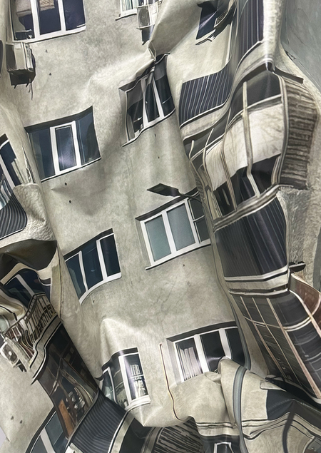 Объект из серии «Баннерная архитектура» — исследование изменчивости и многослойности архитектуры города. Напечатанные на баннерах архитектурные элементы соединяются друг с другом в динамические структуры, которые, с одной стороны, напоминают реальные здания Пресненского района. Однако, с другой стороны, искажая изображение, я ставлю под вопрос возможность их реального существования в городе.