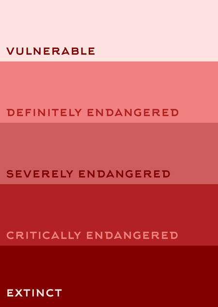 - Уязвимый (Vulnerable) — на языке разговаривает большинство детей, но его использование может быть ограниченным (например, на языке говорят только дома)