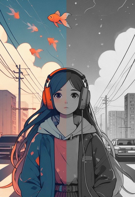 По сюжету героиня едет из дома на учёбу. Когда девушка надевает наушники, мир вокруг неё преображается — благодаря музыке, пробудившей фантазию.