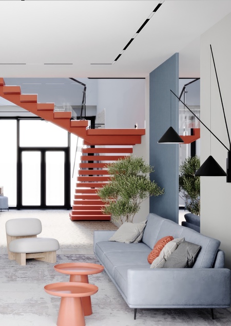 Общая концепция интерьера — нейтральный фон с яркими акцентами. Важно было учесть наличие таких функциональных зон как: большая кухня-гостиная, кабинет для мужа, комната-теплица. Также был разработан фасад дома с обилием стекла.