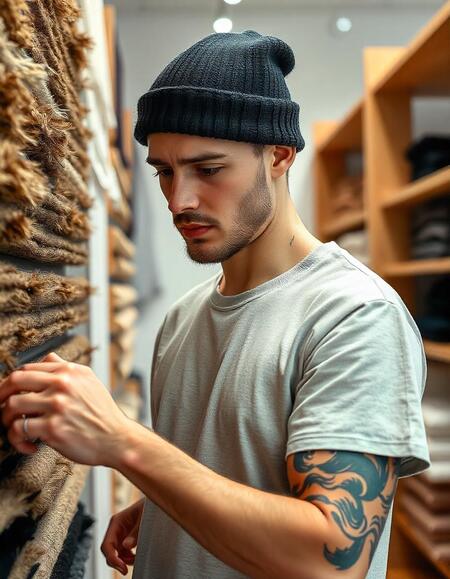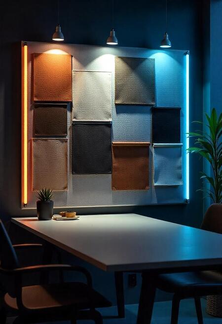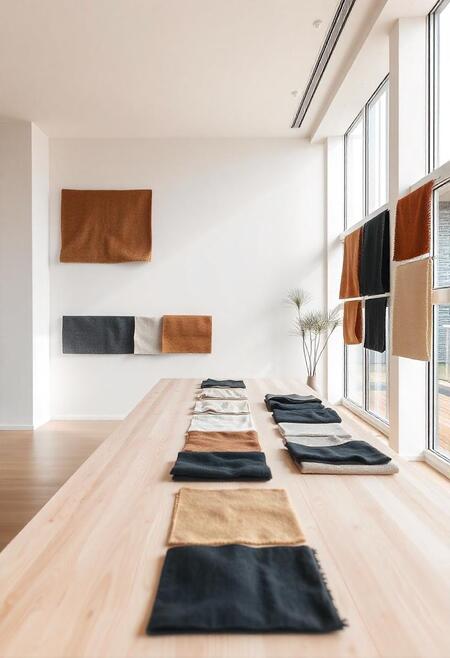 Промт: space for the Tempora company, which uses scans of fabric textures, brown, beige, white, black shades. The company develops fabrics. Minimalist style