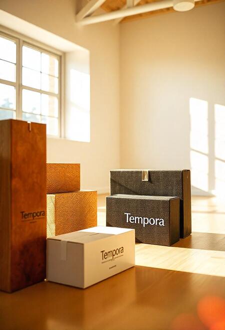 Промт: Packaging boxes for the Tempora company, which uses scans of fabric textures, brown, beige, white, black shades. The company develops fabrics. Minimalist style