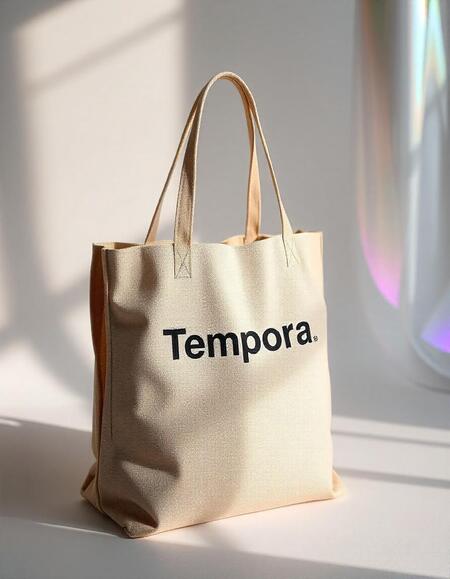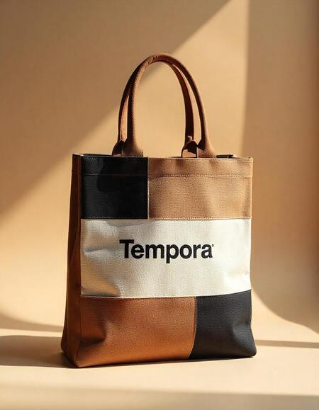 Промт: fabric bag with a logo for the Tempora company, which uses scans of fabric textures, brown, beige, white, black shades. The company develops fabrics. Minimalist style