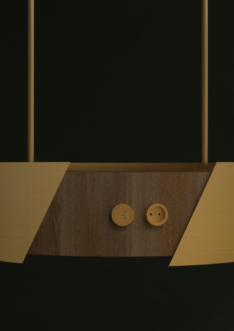 In addition, the incision performs an aesthetic function and masks the junction of the brass sheet’s edges. The fittings (socket housings, decorative flanges) and the mounting tubes hung on the ceiling are also made of brass.