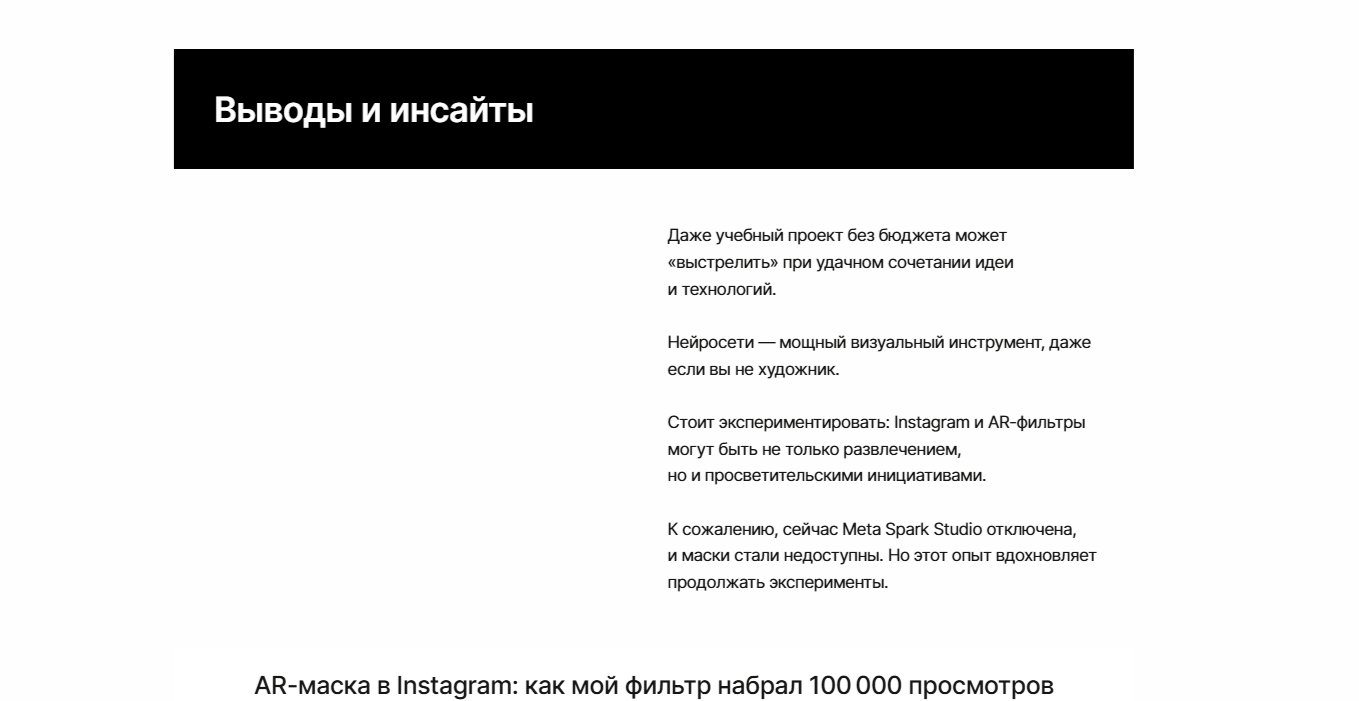 ✍️ Для статьи: «Напиши статью в формате личной истории про то, как я сделала AR-фильтр в Instagram, который набрал 100 000 просмотров. Текст должен быть структурирован: вводная, что произошло, почему это важно, что я узнала.»