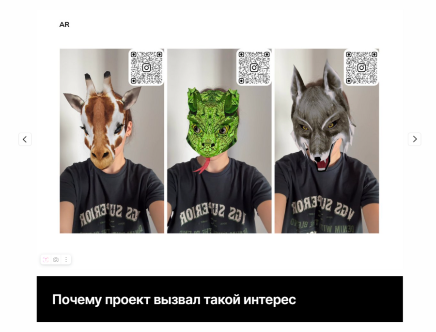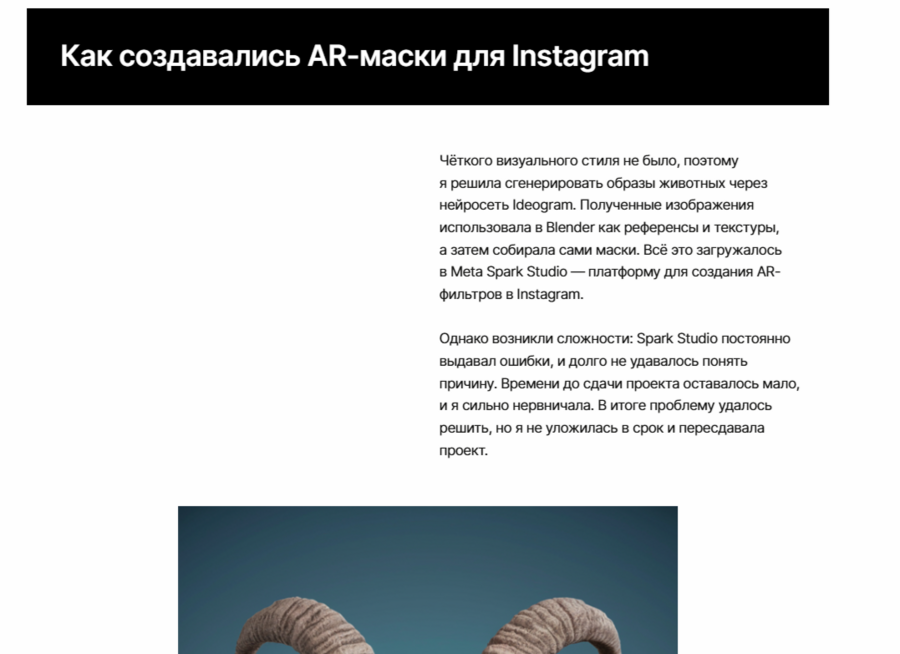 Целью проекта было продемонстрировать, как с помощью инструментов искусственного интеллекта можно создать и продвинуть медиаматериалы, рассказывающие о собственном опыте и проектах. Я использовала ИИ для написания статьи о создании AR-фильтра в Instagram, набравшего более 100 000 просмотров, а также для сценария видео в формате Shorts о стоп-моушн-анимации. Задача заключалась в том, чтобы повысить охваты и вовлечённость этих историй на разных платформах, протестировать, какие форматы «работают», и оценить влияние нейросетей на креативный процесс.
