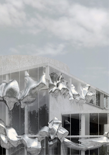 Формообразование здания театра основано на динамическом образе всплеска воды, возникающего при падении предмета. Этот мимолётный момент запечатлён и преобразован в архитектурную форму, сочетающую в себе текучесть и энергию.
