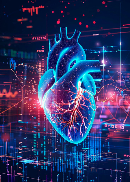 Промпт: «Generate an image showcasing the human heart represented in the form of graphs. The visual should be vertical with a backdrop filled with numerous graphs. The predominant colors in the image should be blue and red, enhancing the overall visual impact.»