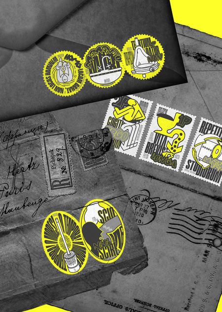 В марках используется крупная, яркая типографика, ковровая композиция. Цветовая гамма минималистична, присутствует только один акцентный цвет.