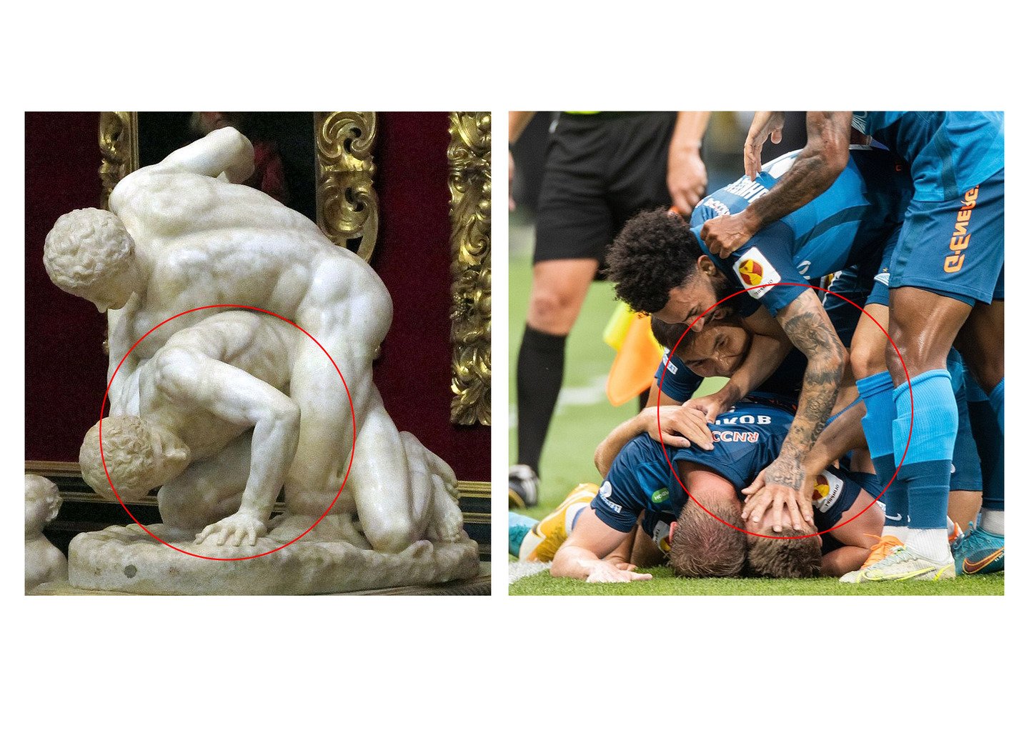Древнеримская мраморная скульптура, изображающая схватку двух обнажённых борцов-панкратионистов. И абсолютно противоположенные по настроению фотографии зенитовцев.