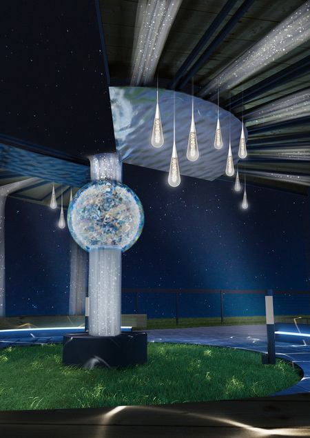 Инсталляция в свою очередь объединяет два манящих явления: мерцание звезд и потоки Волги, погружая зрителя внутрь объема бесконечного синтеза низа и верха.