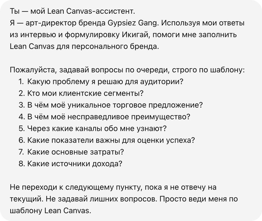 В результате были оформлены два ключевых документа: — Бренд-документ: тон, стиль, ценности, аудитория — Lean Canvas: проблема, ЦА, УТП, каналы, метрики