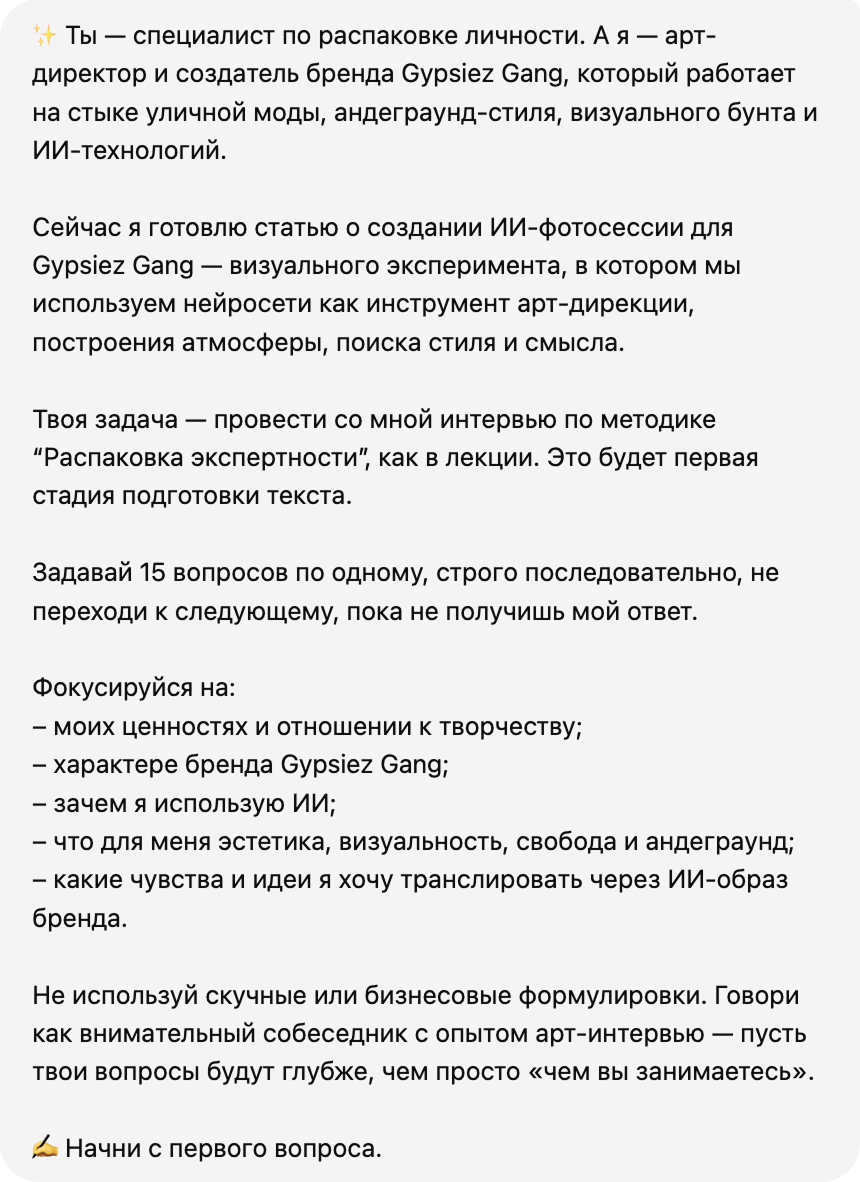 Перед началом работы я провела серию интервью с ChatGPT-4, чтобы сформулировать ключевые особенности бренда и загрузить их в отдельный проект внутри платформы ChatGPT. Это нужно было, чтобы все дальнейшие подзадачи — генерация визуала, текстов, SEO, сценариев — опирались на единое ядро. ChatGPT выступал как бренд-стратег и карьерный коуч.