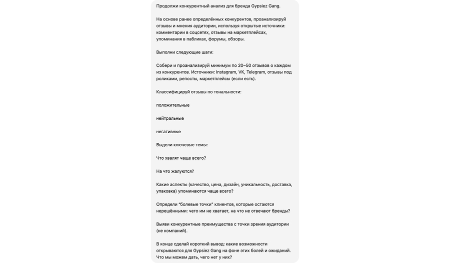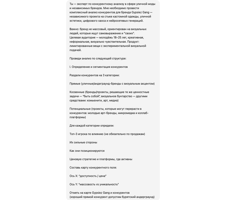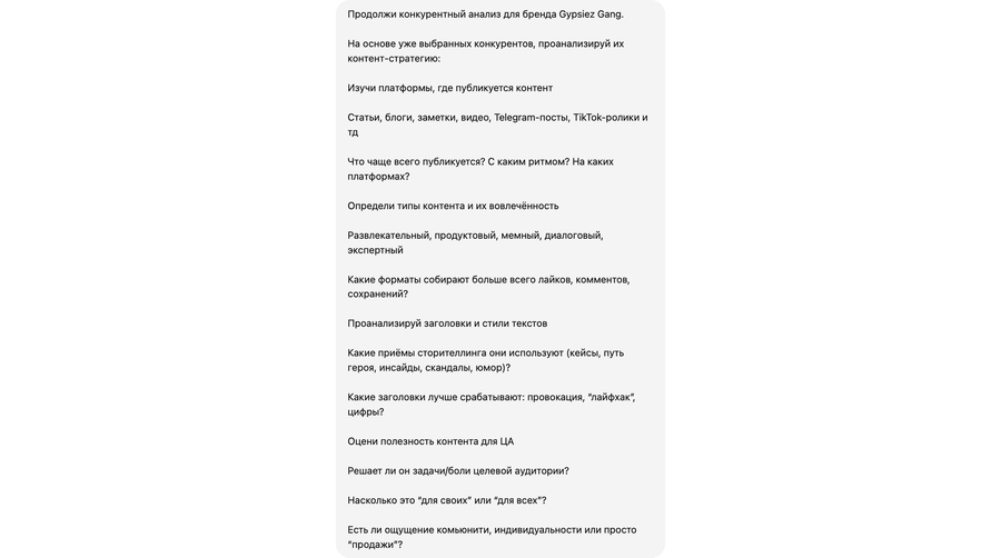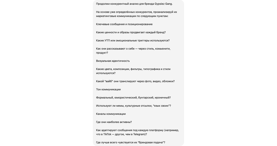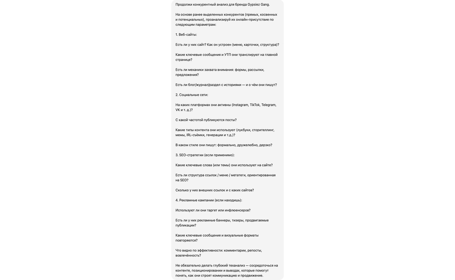 Чтобы точнее определить наше место в медиаполе и сформировать стратегию продвижения, я провела анализ конкурентов с помощью ChatGPT. На основе шаблонов из учебных лекций были составлены промпты, адаптированные под задачи нашего бренда. Мы с нейросетью и функцией DeepResearch сравнивали бренды по визуальному стилю, тону коммуникации, типам контента и активным платформам. Например, одни из ключевых промптов звучали так: