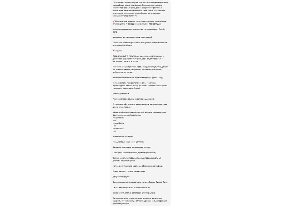 После анализа конкурентов следующим шагом стал тренд-скан. Я провела отдельный анализ каждой из платформ — YouTube Shorts, VK Клипы, Нельзяграм Reels, VC.ru и Яндекс Дзен — чтобы понять, какие темы и форматы действительно работают. Для этого вместе с ChatGPT составили серию промптов, ориентированных на выявление виральных публикаций за последние 1–2 месяца. Все промпты были адаптированы под эстетику бренда и цели проекта.