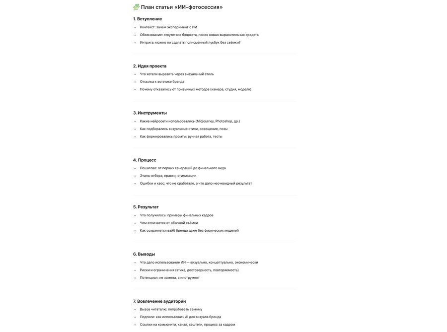— AI-лукбук, изначально опубликованный в Дзене как визуальный лонгрид, был перенесён на VC.ru: • заголовок переписан под комьюнити-форму (добавлен формат «опыт» и брендинг) • введены подзаголовки и структура с блоками «что сделали / как / выводы» Визуальные генерации остались прежними