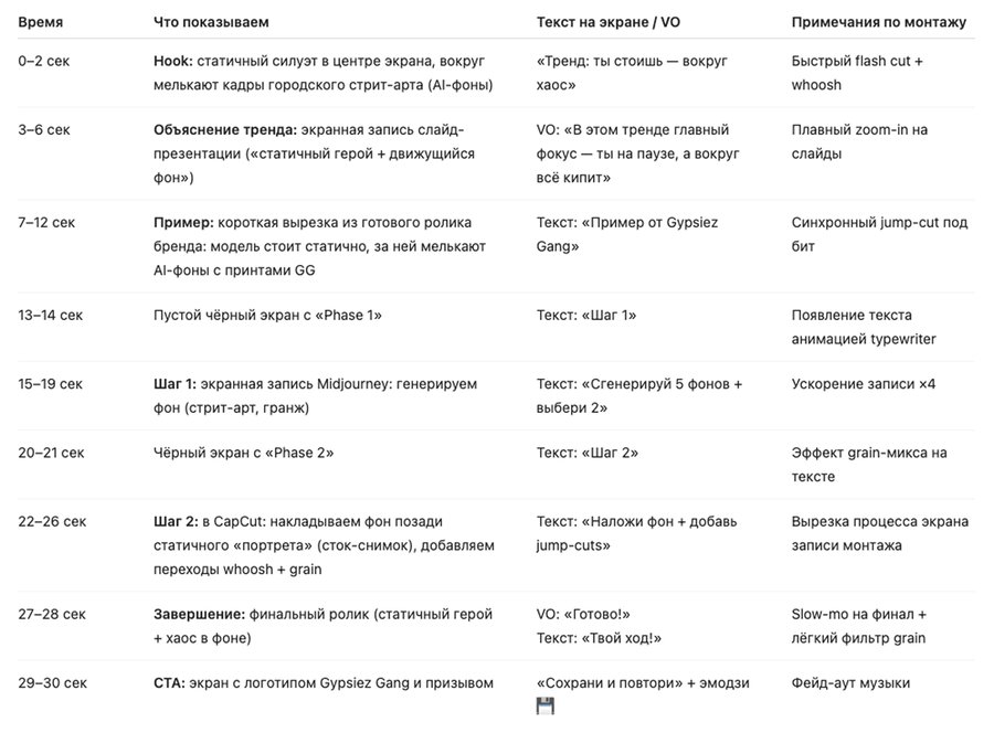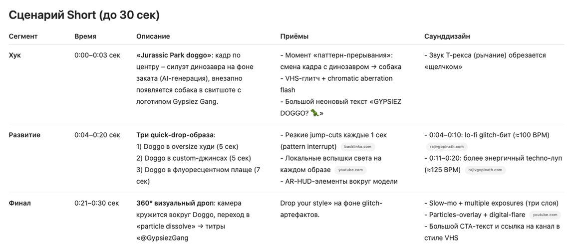 Я не просто адаптирую один видеоряд под разные платформы, но и заранее проектирую монтаж, хук и структуру так, чтобы видео выглядело органично в каждой среде. Для этого в диалогах формировались таблицы с раскадровкой, уточнялись монтажные приёмы, аудиосопровождение, стиль заглушек и визуальный язык.