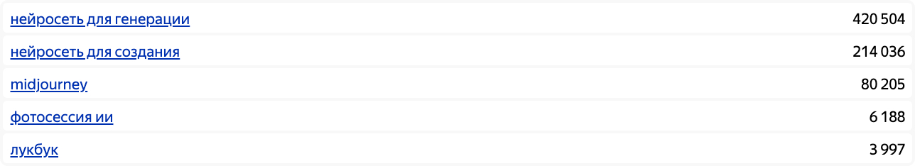 Яндекс Дзен — SEO-платформа Для Дзена ключевым источником трафика является поисковый спрос. Поэтому первым шагом стало формирование семантического ядра: я использовала открытые данные из Wordstat, чтобы собрать реальные запросы пользователей по теме нейросетей, моды и фотосессий.