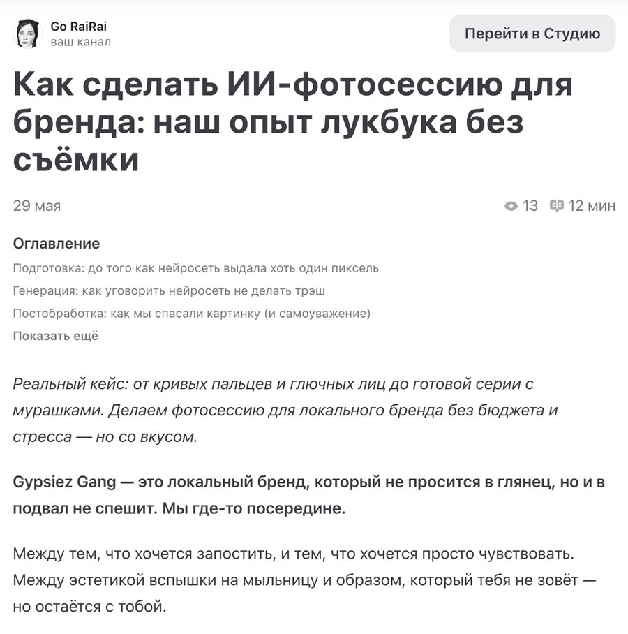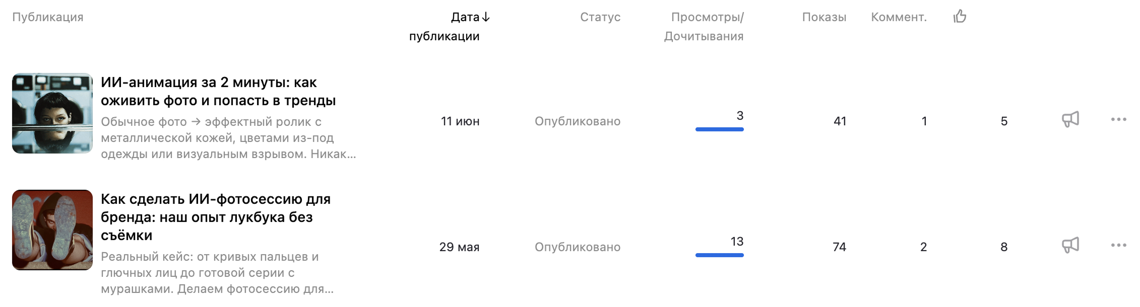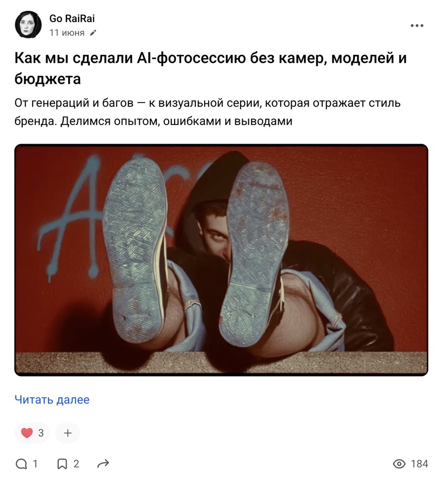 На VC.ru вышло две статьи: гайд по Higgsfield (330 просмотров, 8 комментариев, 3 сохранения) и AI-лукбук (184 просмотра, 1 комментарий, 2 сохранения). Больше вовлечения собрал гайд — благодаря чёткому заголовку, структуре и визуальным примерам. Лукбук, несмотря на насыщенность визуалом, зашёл слабее: формат оказался менее релевантен аудитории VC.