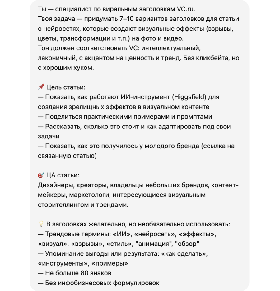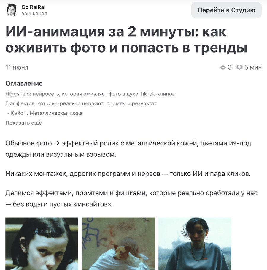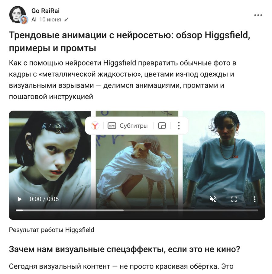 — Обзор Higgsfield, созданный для VC.ru, был переработан в Дзен-формат: • стиль стал ближе к нарративу • добавлена «живость» в подаче: «как мы сами попробовали» • заголовок переписан с упором на поисковую видимость, а не на сервис Скриншоты, гифки и визуальные демонстрации остались теми же.