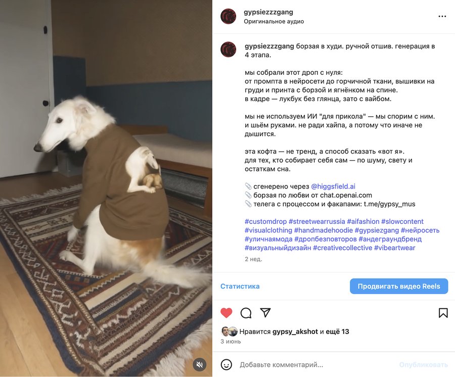 — Короткое видео с борзой в худи, сгенерированное из статичных изображений и анимированное в Higgsfield, было размещено на VK Клипах и YouTube Shorts.